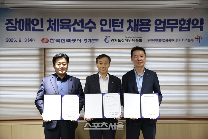 〔스포츠서울│수원=좌승훈기자〕경기도장애인체육회는 3일 한국전력공사 경기본부,, 한국장애인고용공단 경기지역본부와 장애인체육 선수들의 안정적인 고용 및 스포츠 활동을 지원을 위한 3자간 업무협약을 체결했다.