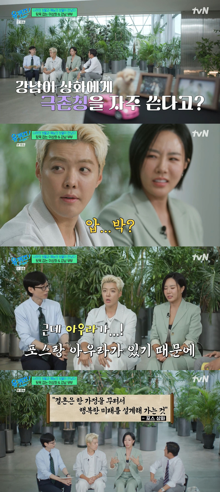 이상화에게 “상화씨, 식사하셨어요?”와 같은 극존칭을 쓴다는 강남은 “(이상화가)아우라가 있기 때문에 압박이 있는데 사귈 때는 이 정도의 압박이 없었지만 결혼한 후에는 압박이 심해진다”고 밝혔다.