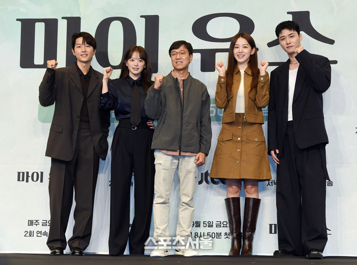 4일 서울 구로구 더링크서울 트리뷰트 포트폴리오 호텔에서 진행된 JTBC 금요시리즈 ‘마이 유스 ’제작발표회에서 주연 배우들이 취재진을 향해 포즈를 취하고 있다. 왼쪽부터 배우 송중기, 천우희, 이상엽 감독, 배우 이주명, 서지훈.