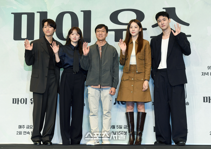4일 서울 구로구 더링크서울 트리뷰트 포트폴리오 호텔에서 진행된 JTBC 금요시리즈 ‘마이 유스 ’제작발표회에서 주연 배우들이 취재진을 향해 포즈를 취하고 있다. 왼쪽부터 배우 송중기, 천우희, 이상엽 감독, 배우 이주명, 서지훈.