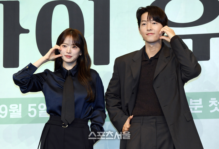 배우 천우희(왼쪽)와 송중기가 4일 서울 구로구 더링크서울 트리뷰트 포트폴리오 호텔에서 진행된 JTBC 금요시리즈 ‘마이 유스 ’제작발표회에서 취재진을 향해 포즈를 취하고 있다.