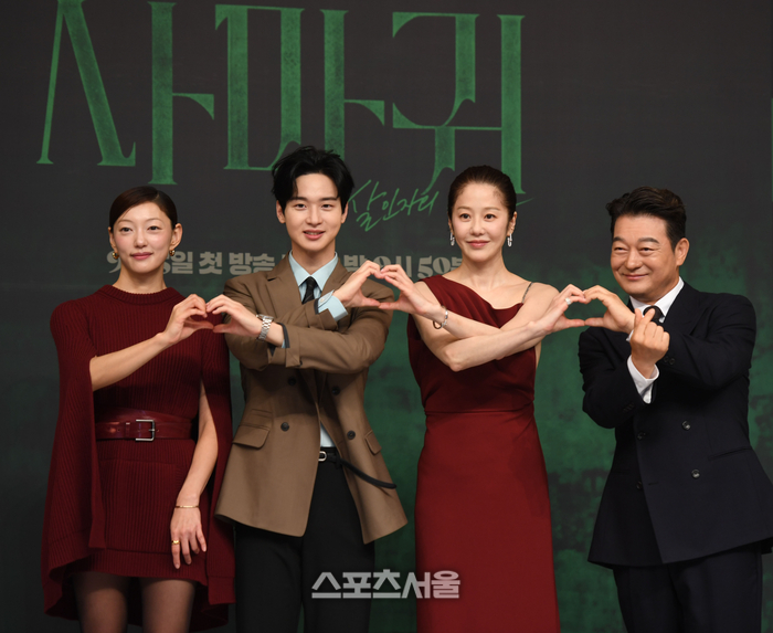이엘, 장동윤, 고현정, 조성하(왼쪽부터)가 4일 서울 목동 SBS 사옥에서 열린 SBS 금토 드라마 ‘사마귀 : 살인자의 외출’ 제작발표회에서 포즈를 취하고 있다.