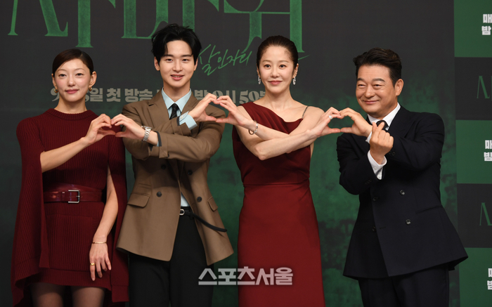 이엘, 장동윤, 고현정, 조성하(왼쪽부터)가 4일 서울 목동 SBS 사옥에서 열린 SBS 금토 드라마 ‘사마귀 : 살인자의 외출’ 제작발표회에서 포즈를 취하고 있다.