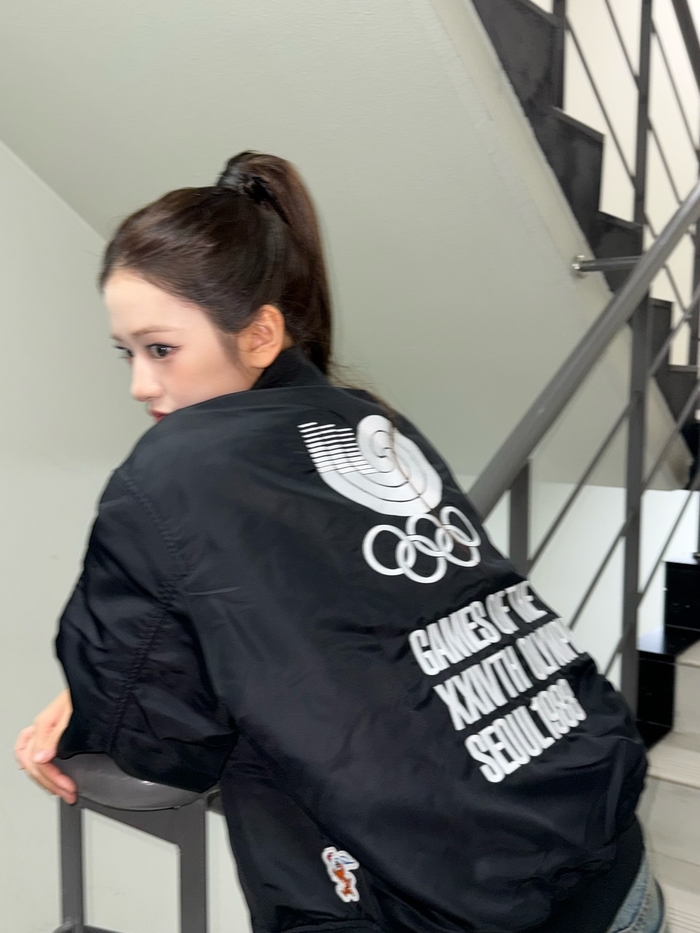 사진 속 안유진은 루즈핏 데님 팬츠 위로 블랙 컬러의 재킷을 걸치고 있으며 재킷에는 1998년 서울 올림픽의 상징인 호돌이와 올림픽 오륜 마크, 그리고 ‘GAMES OF THE XXIV OLYMPIAD SEOUL 1988’ 문구가 새겨져 있다.