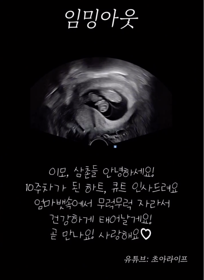 특히 초아는 “경부가 없어 조산 위험이 있는 상황 때문에 일부러 배아를 1개만 이식했는데도, 자연 분열로 일란성 쌍둥이가 되었다. 1%확률이라고 합니다”고 전했다. 초아는 현재 임신 10주 2일차로 쌍둥이 자녀의 태명을 ‘하트’와 ‘큐트’로 정하고, 건강하게 두 아이를 품기 위해 힘쓰고 있다고 밝혔다.