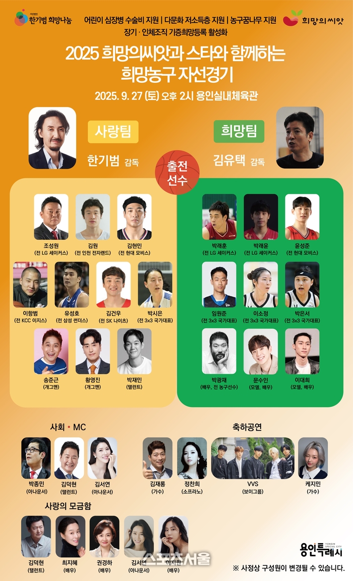 〔스포츠서울│용인=좌승훈기자〕경기 용인시는 오는 27일 오후 2시 용인실내체육관에서 이상일 시장 등이 참석한 가운데 ‘2025 희망의씨앗과 스타와 함께하는 희망농구 자선경기’가 열린다고 7일 밝혔다.