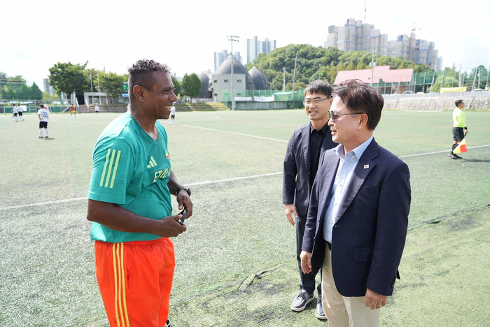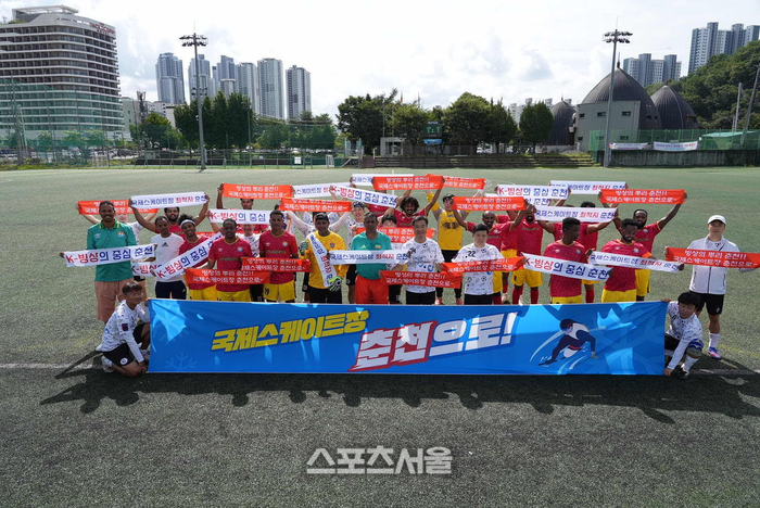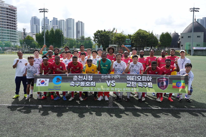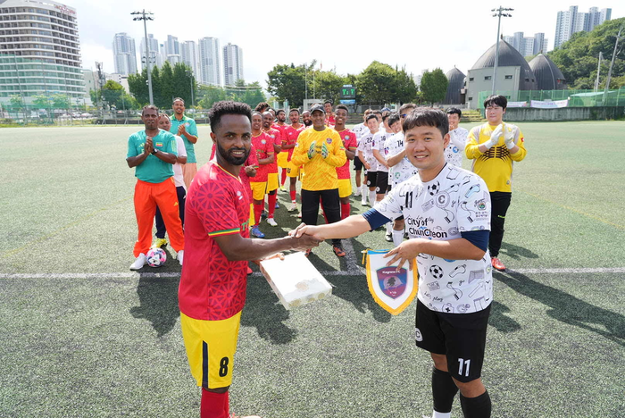 [스포츠서울ㅣ춘천=김기원기자]춘천시청 축구동호회와 에티오피아 교민 축구팀인 ‘강뉴 FC’가 7일 공지천 A구장에서 친선 경기를 가졌다. 경기에 앞서 양 팀 선수단은 참전기념탑을 찾아 헌화했다.