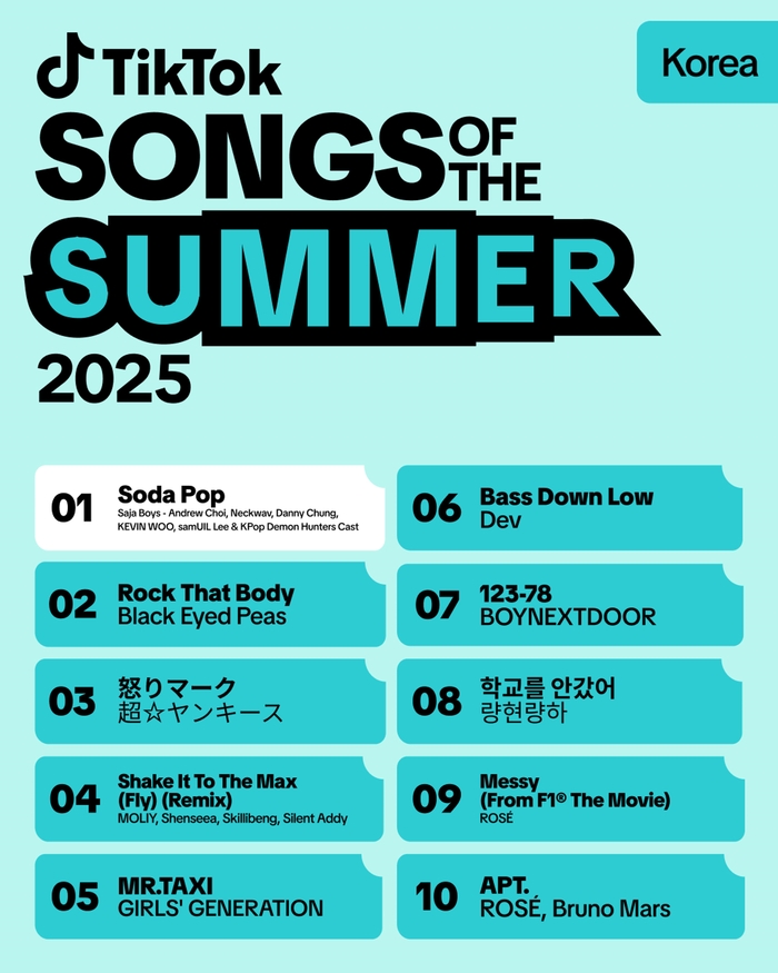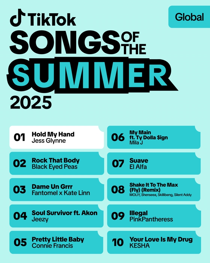 틱톡(TikTok)은 올여름 전 세계에서 가장 많이 사용된 음원을 집계한 ‘올해의 여름 노래’ 글로벌 및 국가별 리스트를 발표했다. 해시태그 #SongOfTheSummer(여름의 노래)를 중심으로 제작된 63만 건 이상의 영상은 챌린지, 댄스 커버, 립싱크 등 다양한 형태로 확산되며 여름철 음악 트렌드를 주도했다.\