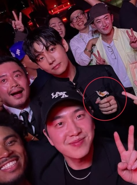 이날 애프터 파티에서 포착된 한 장의 사진이 시선을 집중시켰다. 와인이 어울리는 세련된 파티 현장에서 뷔는 썰지 않은 통김밥 한 줄을 손에 꼭 쥐고 무표정한 얼굴로 찍혔다. 김밥에는 한 입 베어 문 자국도 남아 있다.
