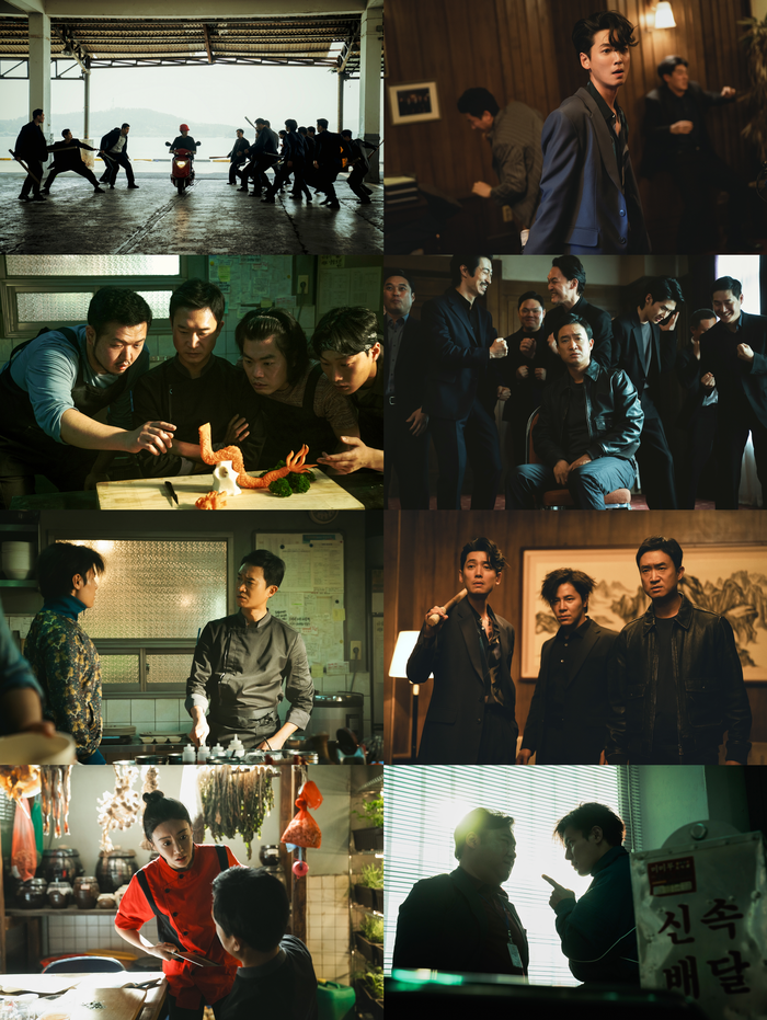 또한 ‘식구파’ 2인자인 순태가 조직에서 포스 넘치는 모습과 상반되게 화려하게 조각된 음식을 앞에 두고 진지하게 바라보고 있거나 자신이 원치 않는 보스 자리를 맡을 위기에 처하자 망연자실한 표정을 짓고 있는 모습들이 유쾌한 웃음을 자아낸다.