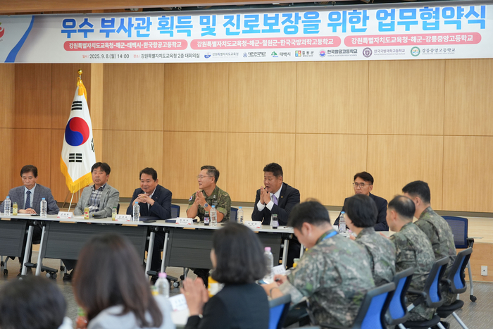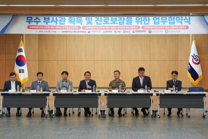 [스포츠서울ㅣ춘천=김기원기자]강원특별자치도교육청(교육감 신경호)은 9월 8일(월) 14시 본청에서 해군(준장 박태규)·태백시(시장 이상호)·철원군(군수 이현종)·한국항공고(교장 문명호)·한국국방과학고(교장 이창근)·강릉중앙고(교장 고태환)와 해군 부사관 육성을 위한 업무 협약을 체결했다.