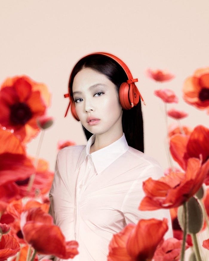 제니는 강렬한 레드 컬러가 돋보이는 ‘Beats Solo 4 - JENNIE Special Edition’ 헤드폰을 착용한 채, 캐주얼한 화이트 티셔츠와 네이비 스트라이프 팬츠를 매치해 편안하면서도 세련된 스타일을 연출했다.