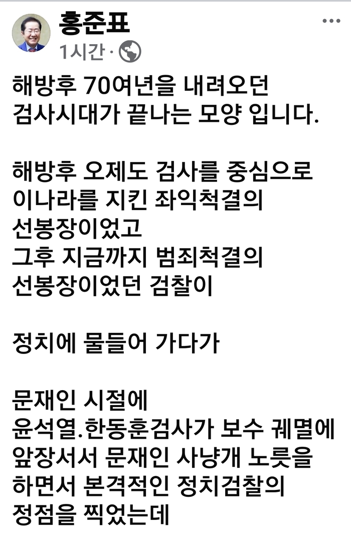 [스포츠서울 | 이상배 전문기자] 8일 홍준표 전 대구시장은 자신의 페이스북에서 “해방 후 70여년을 내려오던 검사 시대가 끝나는 모양이다”라는 입장을 내놨다.