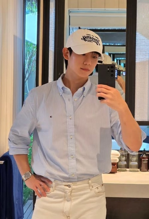 정해인은 최근 자신의 SNS에 여러 장의 사진을 게재했다. 공개된 사진 속 정해인은 하늘색 셔츠에 화이트 팬츠를 매치해 깔끔하고 댄디한 매력을 뽐낸다.