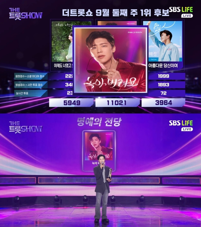 박지현은 8일 오후 방송된 SBS Life ‘더 트롯쇼’에서 김용빈의 ‘어제도 너였고 오늘도 너여서’, 진해성의 ‘아름다운 당신이여’와 치열한 경쟁을 펼쳤다. 그 결과 총점 1만1021점을 기록하며 최종 1위를 차지, 개인 통산 다섯 번째 명예의 전당에 이름을 올렸다.