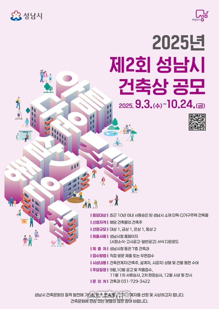 시 관계자는 “지난해 첫 공모가 성공적으로 마무리된 만큼, 올해에도 수준 높은 주택 작품들이 많이 참여해 성남시 건축물의 품격을 더욱 높이는 계기가 되기를 기대한다”고 말했다.