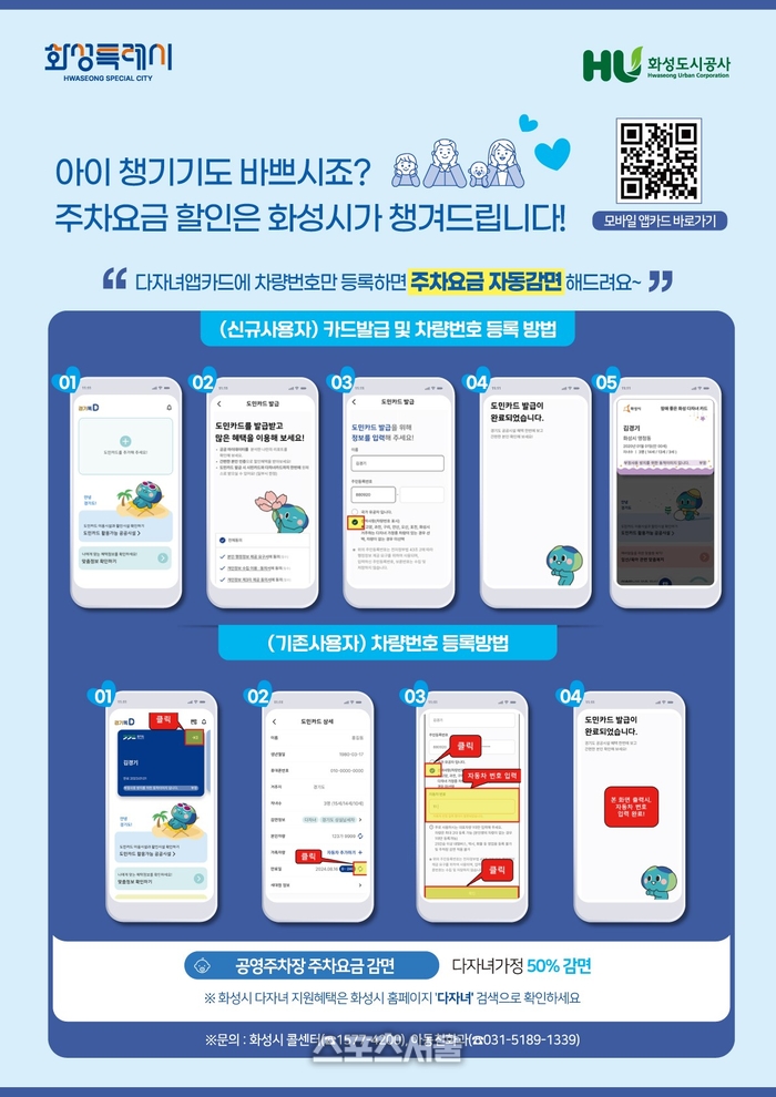 시는 현재 다자녀가정(2자녀 이상)을 대상으로 ‘맘애좋은 화성다자녀카드’를 발급해, 공영주차장 67개소에서 주차 요금의 50%를 감면하는 등 다양한 우대 혜택을 제공하고 있다.