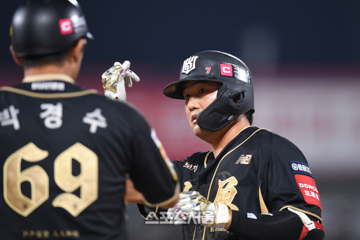 KT 김상수가 9일 수원 KT위즈파크에서 열린 2025 KBO리그 두산과 경기 3회말 우중간 안타를 친 후 세리머니를 하고 있다.