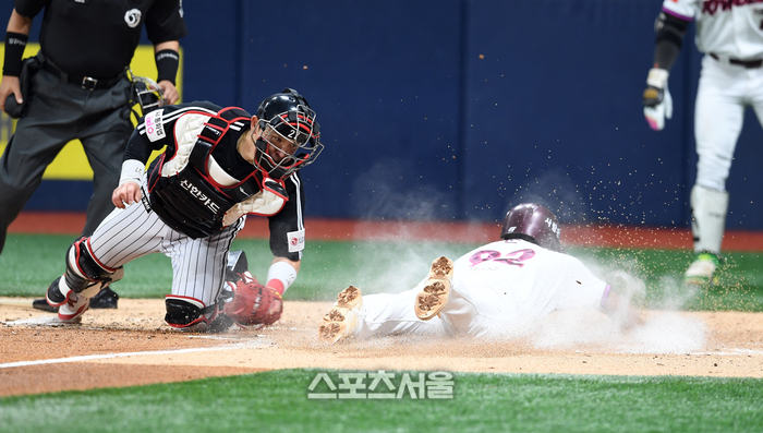 키움 어준서(오른쪽)가 9일 고척스카이돔에서 열린 2025 KBO리그 LG와 경기 2회말 2사 1-2루 상황에서 박주홍의 적시타에 2루에서 홈까지 뛰어 LG 포수 박동원의 태그에 앞서 득점을 하고 있다. 2025. 9. 9.