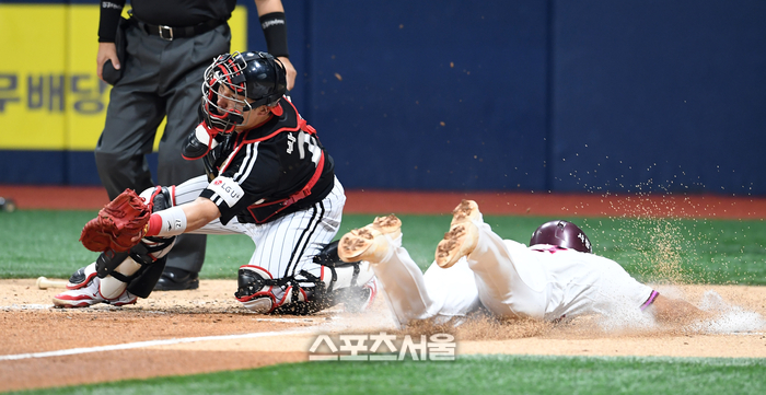 키움 어준서(오른쪽)가 9일 고척스카이돔에서 열린 2025 KBO리그 LG와 경기 2회말 2사 1-2루 상황에서 박주홍의 적시타에 2루에서 홈까지 뛰어 LG 포수 박동원의 태그에 앞서 득점을 하고 있다. 2025. 9. 9.