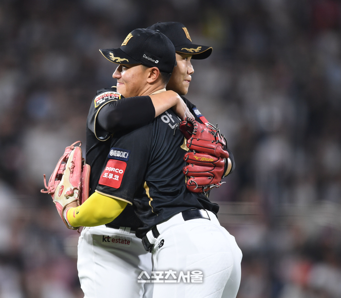 KT 선발투수 소형준이 9일 수원 KT위즈파크에서 열린 2025 KBO리그 두산과 경기 6회초 2사 1,2루 상대 박준순 우전안타 때 케이브 홈 태그아웃 비디오판독 후 아웃 판정이 되자 안현민과 포옹을 하고 있다.