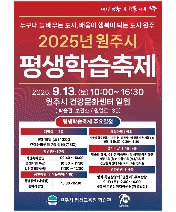 [스포츠서울ㅣ원주=김기원기자]원주시 평생교육원 학습관은 오는 13일 건강문화센터 일원에서 ‘누구나 늘 배우는 도시, 배움이 행복이 되는 도시 원주!’를 주제로 ‘2025년 원주시 평생학습축제’를 개최한다.