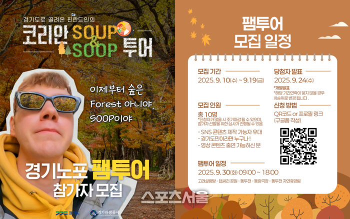 모집대상은 만 19세 이상의 경기도 거주자며 인스타그램·블로그·유튜브 등 SNS 운영자는 선발 과정에서 우대된다. 선발 인원은 총 10명으로 여행 경비 전액이 지원된다. 참가신청은 경기관광공사 인스타그램을 통해 구글 폼으로 접수 가능하다. 당첨자 발표는 24일 있을 예정이다.