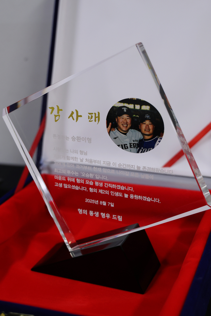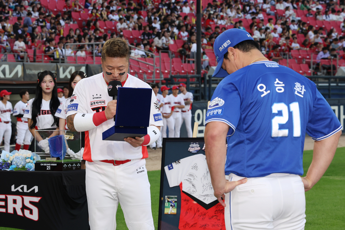 동시에 절친한 후배 최형우가 오승환을 위해 개인적으로 감사패를 준비했다. 마이크를 잡고 직접 낭독했다. 최형우는 읽으며 눈물을 보였다. 오승환도 울컥한 모습이다. 오승환도 답례 의미로 사인 글러브를 준비해 KIA 선수단에 선물했다.