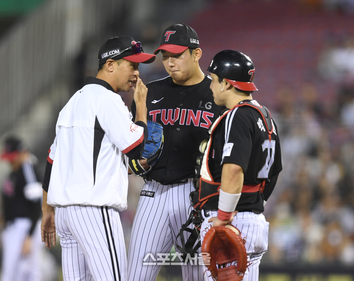 LG 김광삼 투수코치가 10일 서울 잠실구장에서 열린 2025 KBO리그 두산과 경기 3회 마운드에 올라 손주영, 박동원에 무엇인가 이야기를 하고 있다.