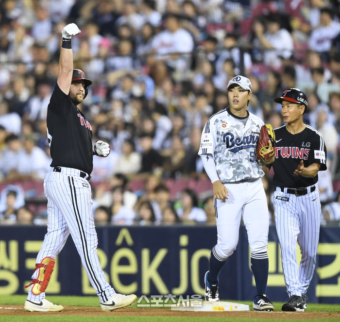 LG 오스틴이 10일 서울 잠실구장에서 열린 2025 KBO리그 두산과 경기 5회초 1사1,2루 1타점 중전안타를 친 후 세리머니를 하고 있다.