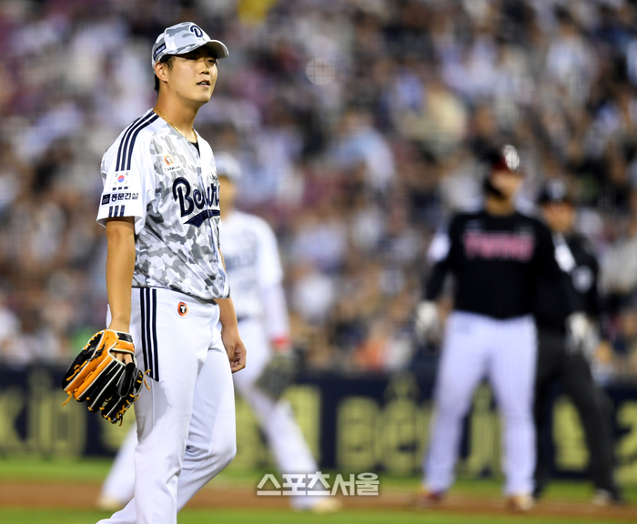 두산 투수 이병헌이 10일 서울 잠실구장에서 열린 2025 KBO리그 LG와 경기 5회초 1사만루 상대 김현수에 볼넷을 허용한 후 아쉬워하고 있다.