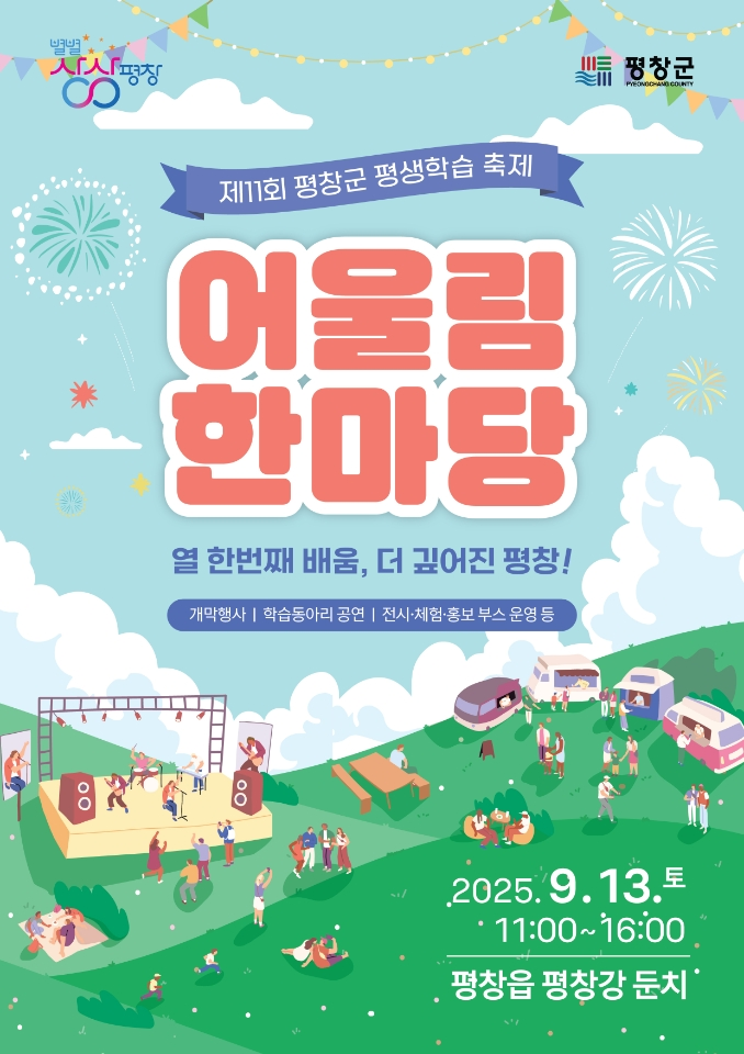 [스포츠서울ㅣ김기원기자]평창군은 오는 9월 13일(금) 평창읍 평창강 둔치에서 제11회 평창군 평생학습축제 ‘어울림한마당’을 개최한다. ※ 우천 시 평창읍 국민체육센터 1층에서 진행