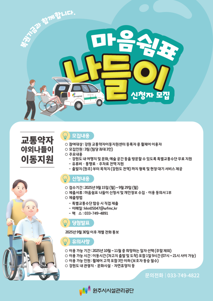 [스포츠서울ㅣ원주=김기원기자]원주시시설관리공단 교통사업부는 이동에 제약이 있는 교통약자에게 문화·여가활동 참여 기회를 제공하기 위해 ‘마음쉼표 나들이’ 프로그램을 오는 10월 1일부터 11월 30일까지(주말 제외) 운영한다.