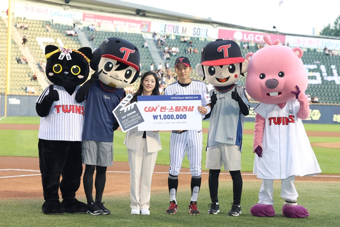 한국야구위원회(KBO)와 CGV는 11일 서울 잠실구장에서 경기 전 시상식을 진행했다. 이날 시상식에는 CGV 콘텐츠운영팀 전정현 팀장이 참석해 수상자인 박해민에게 상금 100만원을 비롯해 CGV 씨네드쉐프 무비&다이닝 패키지를 부상으로 수여했다.
