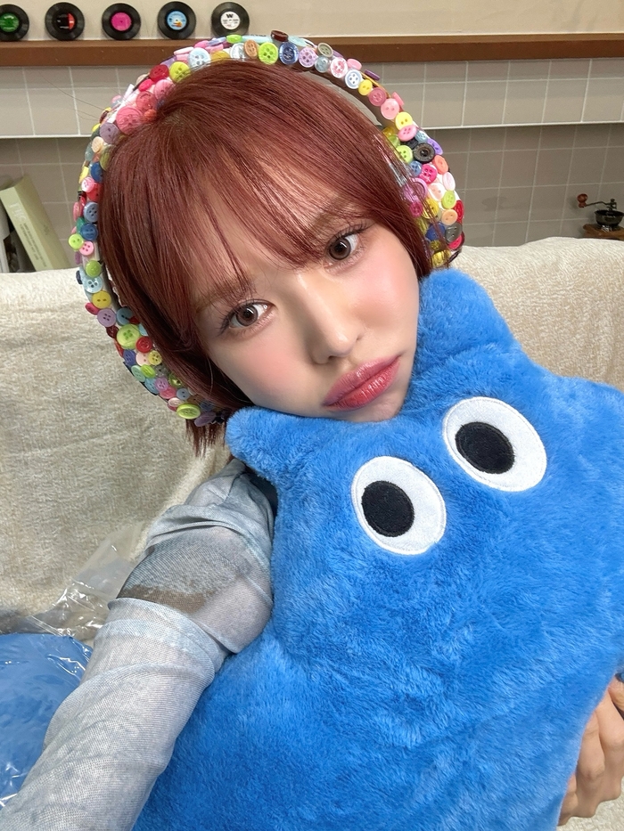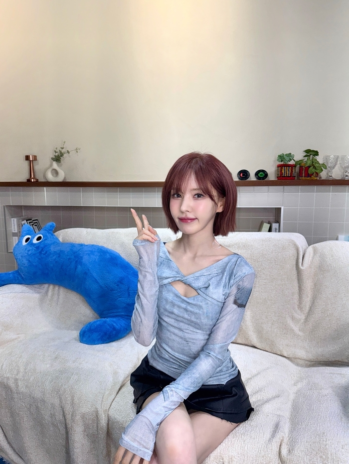 사진 속 웬디는 소파에 앉아 귀여운 파란색 쿠션을 들고 V 포즈를 취하는 일상 속 친근한 모습으로 눈길을 끈다.