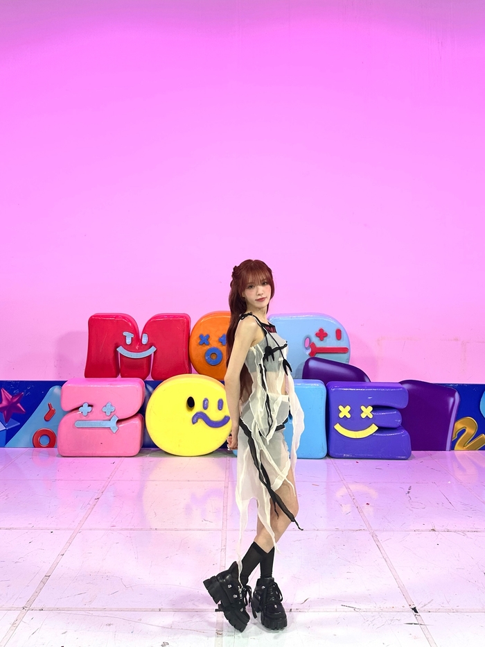 광고 촬영중인 웬디는 핑크빛 배경 앞에서 과감한 디자인의 시스루 미니드레스와 독특한 블랙 플랫폼 슈즈를 매치해 트렌디하고 모던한 분위기를 보여주고 있다. 긴 웨이브 헤어와 자연스러운 포즈, 환하게 웃는 표정이 웬디 특유의 상큼하고 밝은 에너지를 보여준다.