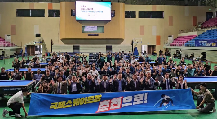 [스포츠서울ㅣ춘천=김기원기자]12일 호반체육관에서 열린 제4회 춘천시장배 전국장애인당구대회 개회식에서 내빈 및 참가 선수들이 국제스케이트장 춘천 유치 퍼포먼스를 진행했다.