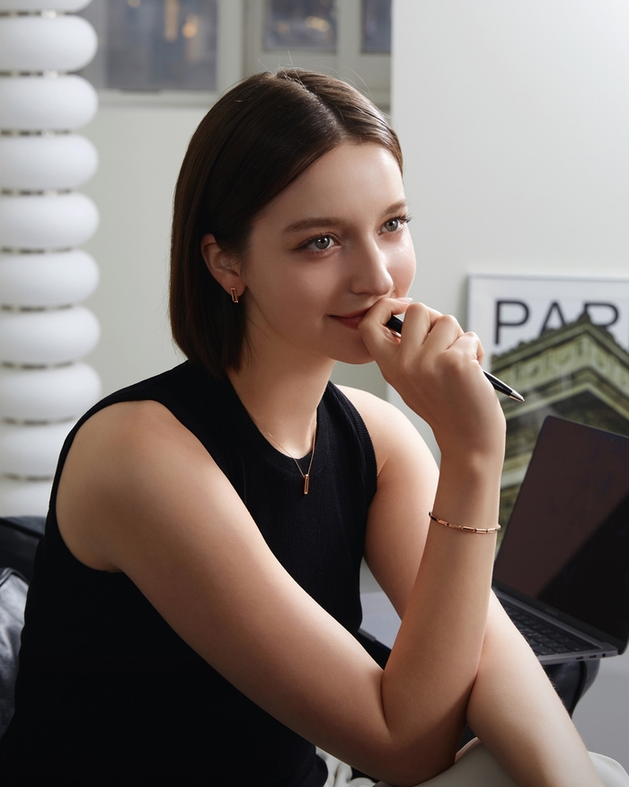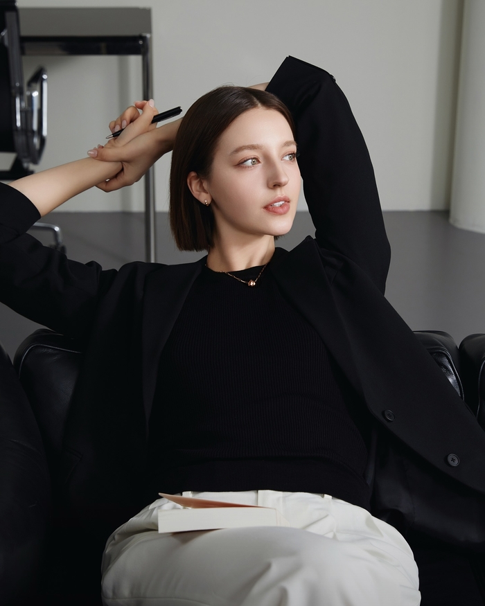 사진 속에서 다닐로바는 펜을 들고 진지하게 생각에 잠긴 모습부터 노트에 무언가를 기록하는 지적인 포즈, 그리고 소파에 앉아 편안하면서도 세련된 분위기를 자아냈다. 목걸이와 이어링, 브레이슬릿 등 주얼리의 은은한 반짝임이 그녀의 미모와 스타일을 더욱 돋보이게 했다.