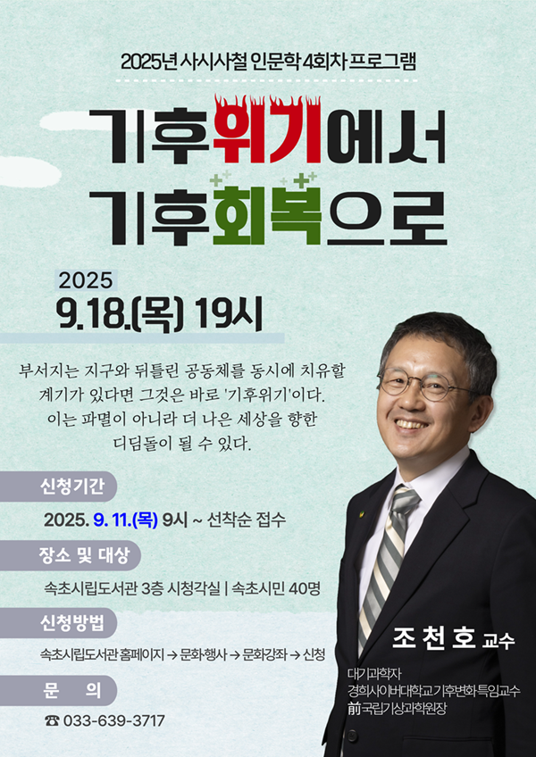 [스포츠서울ㅣ김기원기자]속초시립도서관은 오는 9월 18일(목) 오후 7시 도서관 시청각실에서 시민 40여 명을 대상으로 인문학 특강 ‘기후위기에서 기후회복으로’를 진행한다. 이번 특강은 ‘2025 사시사철 인문학’ 시리즈의 네 번째 프로그램으로 마련됐다.