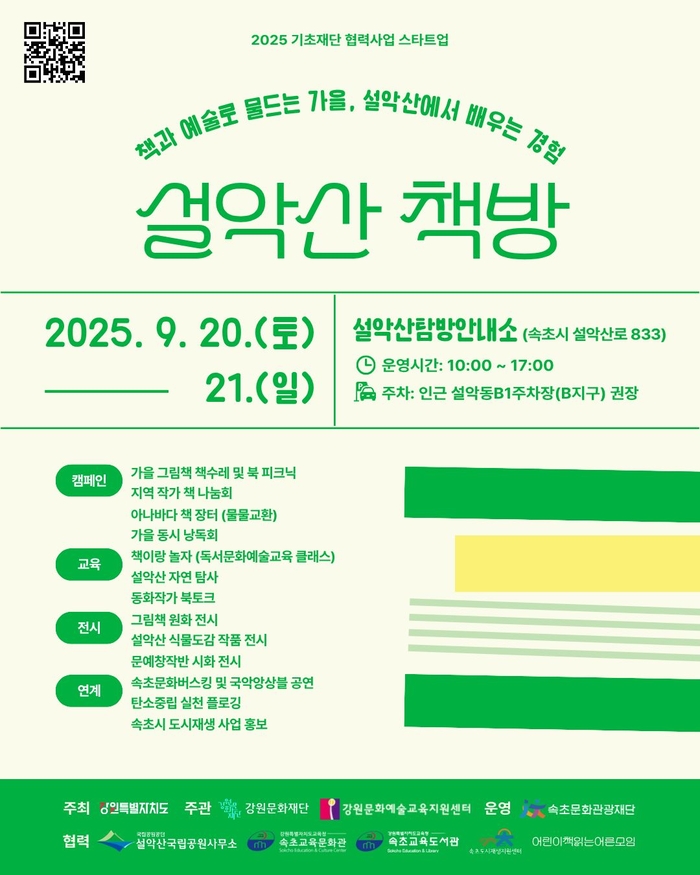 [스포츠서울ㅣ김기원기자]속초문화관광재단(이사장 이병선)은 9월 20일(토)부터 21일(일)까지 이틀간 설악산 탐방안내소 일원에서 ‘설악산 책방’을 개최한다. 본 행사는 강원문화재단 ‘2025 기초재단 협력사업 스타트업’에 3년 연속 선정된 사업의 일환이다.