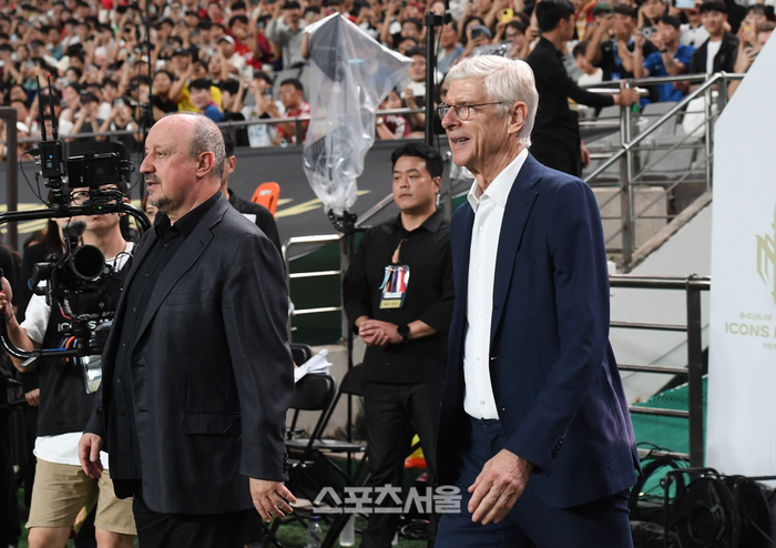 14일 서울월드컵경기장에서 열린 ‘2025 아이콘매치’ FC 스피어와 쉴드 유나이티드의 경기에 앞서 쉴드 유나이티드의 라파엘 베니테스 감독(왼쪽)과 FC 스피엉의 아르센 벵거 감독이 그라운드로 입장하고 있다. 2025. 9. 14.