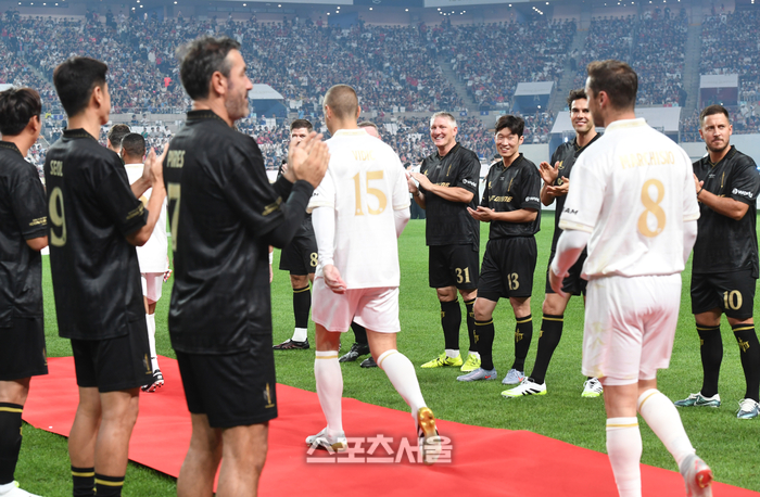 FC 스피어 선수들이 14일 서울월드컵경기장에서 열린 ‘2025 아이콘매치’ 쉴드 유나이티드와의 경기에 앞서 입장하는 쉴드 유나이티드 선수들에게 박수를 보내며 지난해 승리팀에 대한 예우를 하고 있다. 2025. 9. 14.