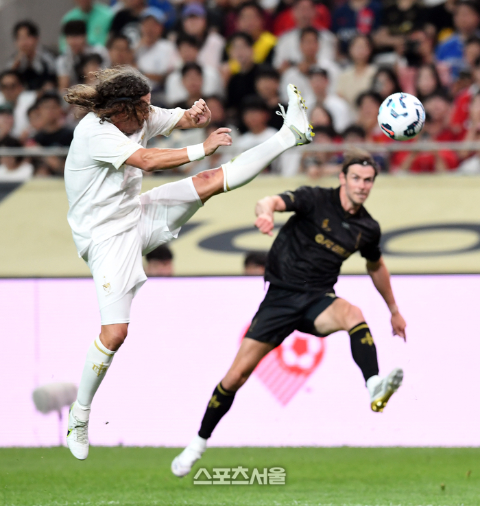 쉴드 유나이티드 푸욜(왼쪽)이 14일 서울월드컵경기장에서 열린 ‘2025 아이콘매치’ FC 스피어와 쉴드 유나이티드의 경기에서 FC 스피어 가레스 베일의 크로스를 막기 위해 발을 뻗고 있다. 2025. 9. 14.