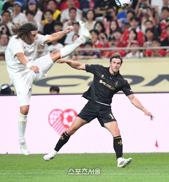FC 스피어의 가레스 베일(오른쪽)이 14일 서울월드컵경기장에서 열린 ‘2025 아이콘매치’ FC 스피어와 쉴드 유나이티드의 경기에서 쉴드 유나이티드 푸욜의 수비를 피해 크로스를 올리고 있다. 2025. 9. 14.