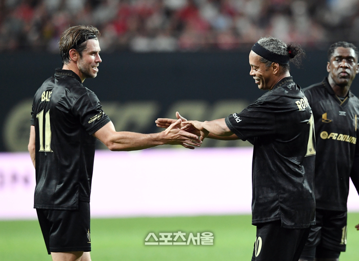 FC 스피어의 호나우지뉴(오른쪽)가 14일 서울월드컵경기장에서 열린 ‘2025 아이콘매치’ 쉴드 유나이티드와의 경기에서 프리킥 슛을 한 뒤 킥을 양보해 준 가레스 베일과 악수를 하고 있다. 2025. 9. 14.
