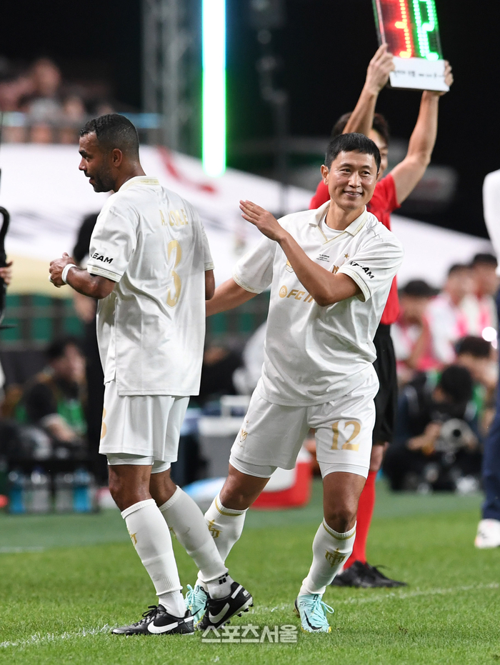 쉴드 유나이티드 이영표(가운데)가 14일 서울월드컵경기장에서 열린 ‘2025 아이콘매치’ FC 스피어와의 경기에서 애슐리 콜을 대신해 그라운드에 들어가고 있다. 2025. 9. 14.
