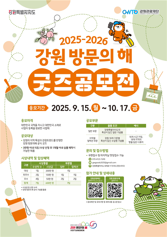 [스포츠서울ㅣ춘천=김기원기자]강원특별자치도와 강원관광재단은 ‘2025-2026 강원 방문의 해’를 기념하여 강원특별자치도의 다채로운 매력을 담은 관광 기념품을 발굴하고자 ‘굿즈 공모전’을 개최한다.