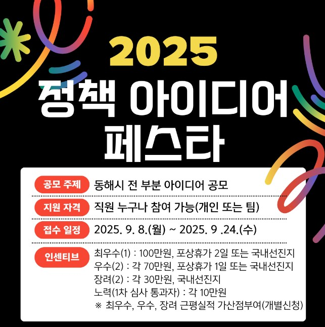 [스포츠서울ㅣ김기원기자]동해시(시장 심규언)는 직원들의 창의적인 아이디어를 발굴해 시정에 즉각 반영함으로써 시민이 체감할 수 있는 정책을 마련하기 위해「2025 정책 아이디어 페스타」를 9월부터 11월까지 추진한다고 밝혔다.