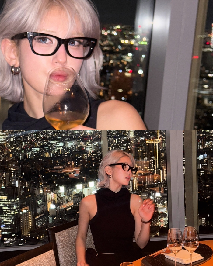 사진 속 전소미는 도시의 불빛이 가득한 야경을 배경으로 세련된 블랙 슬리브리스 드레스와 독특한 뿔테 안경을 매치해 도회적인 매력을 뽐냈다. 짧은 실버 헤어와 은은한 주얼리, 볼드한 시계로 감각적인 스타일링을 완성하며, 자신감 넘치는 포즈와 여유로운 미소가 돋보인다.