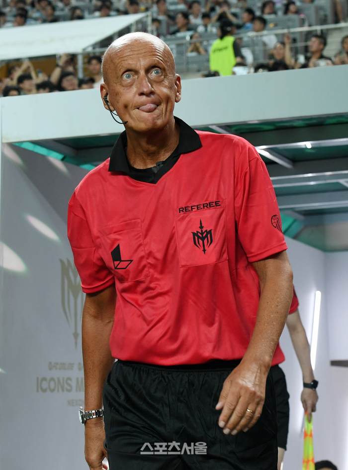 끝이 아니다. 올해 아이콘매치 백미 중 하나는 ‘시대를 대표하는 주심’ 피에를루이지 콜리나의 깜짝 등장이다. 경기 시작 직전 그라운드에 모습을 드러낸 콜리나는 특유의 카리스마 넘치는 눈빛으로 킥오프 휘슬을 불었고, 관중석은 뜨거운 환호로 답했다. ‘선수도 레전드, 심판도 레전드’라는 말이 나왔을 정도.